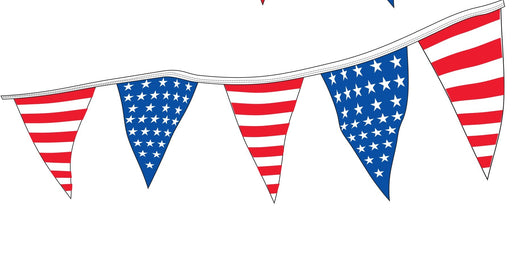 Features: Triangle Star Patriotic Pennants 4 Mil Heavy Duty Poly Material 9"x12" Pennants 60' Length 21 Triangles Per String Sag Resistant Rope