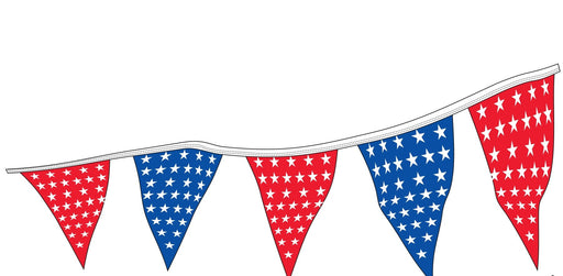 Features: Triangle Star Patriotic Pennants 4 Mil Heavy Duty Poly Material 12"x18" Pennants 100' Length 48 Triangles Per String Sag Resistant Rope