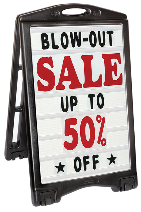 Ready2Use Next Generation Folding, Rolling, Quick Loading, A-frame Sandwich Board Style Sidewalk Sign with changeable message boards. Overall size is 28”(w)x27”(d)x45”(h). Patented and patent pending features for unmatched user friendliness, portability, and affordability. Displays curved sign panels for maximum visibility and includes Side Support Arms to keep unit from spreading open or closing in high winds. Water filled for stability; can withstand freezing. Just Grip-Tip-Roll to move in or out without lifting/carrying to keep user clean and dry; can be moved folded or open. Includes 2 - 24" x 36" x 4mm corrugated plastic white sign panels with tracks on one side of each board, 314-4" letters, numbers, and symbols plus 22 8"numbers and 2-9" SALE/Special headers(Black letters and Red Numbers on white background) displays up to 7 lines of copy on each side. Can withstand winds of up to 30mph.