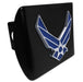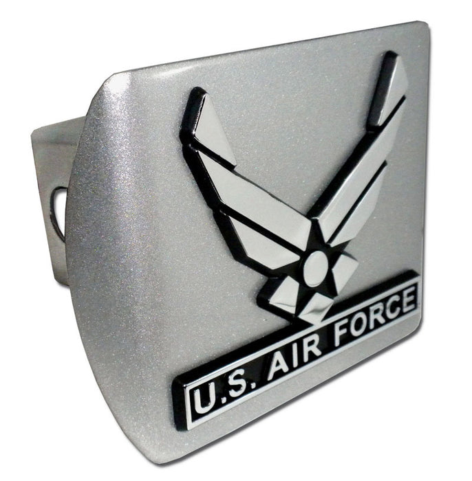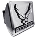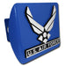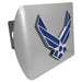 Officially Licensed- United States Air Force Wings ALL-METAL hitch cover (front plate is 5” x 3.5”) . A step above in quality and appearance over cheaper plastic and pewter versions. Comprised of OEM (ABS plastic core with a chrome-plated metal finish) Air Force Wings emblem adhered to a royal all-metal hitch cover mount, all Made in the USA. Hitch cover fits standard 2” trailer hitch receivers (if it does not fit perfectly, you may return for a full refund).