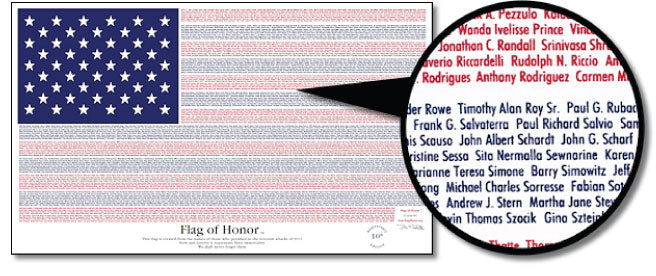 This flag has been created with the sincerest intentions of honoring the victims of the terrorist attacks of September 11, 2001. Our goals are to immortalize each individual victim, to give comfort to the families left behind by knowing that their loved ones will be forever honored and remembered and to create an enduring symbol, recognized by the world, of the human sacrifice that occurred on that day in 2001.