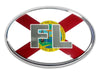 Florida shiny chrome auto emblem (3.625” x 2.5” x .125”) by Elektroplate. All-metal (NOT plastic) with a chrome-plated frame and a full-color domed decal insert. The decal is UV-protected with a laminated 1/8” thick PVC made to withstand any outdoor conditions. The emblem attaches via paint-safe 3M adhesive foam tape.