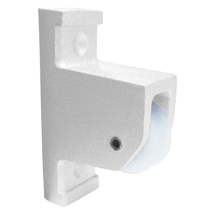 This vertical mount pulley assembly is made with durable and rust proof cast aluminum construction. It features a 1 1/2" outside diameter nylon pulley on a 1/4" stainless steel axle. Maximum halyard diameter is 5/16". Available in 4 colors and pre-drilled.