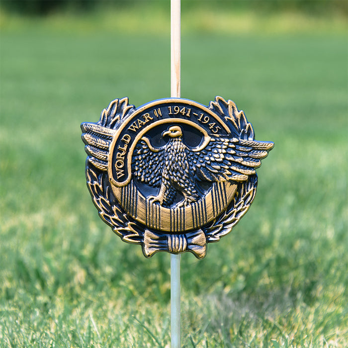 Honor the memory of those who served our country with Flagman's WW2 Veteran Grave Marker & Flag Holder with Aluminum Ground Spike. Crafted from durable thermoplastic and finished to resemble antique bronze, these grave markers offer a timeless tribute. 100% made in the USA to honor American heroes.